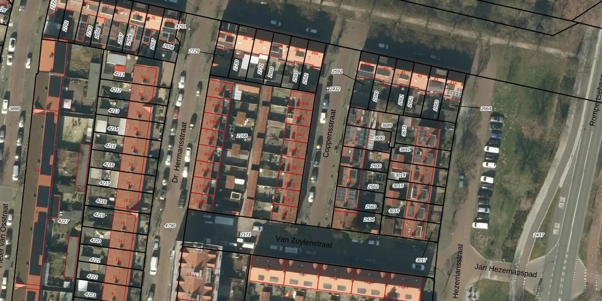 Het perceel waarop Coppensstraat 18 staat heeft een oppervlakte van 1590 m². Dit is een zeer groot perceel. De perceeloppervlakte wordt geregistreerd door het Kadaster. Gedetailleerde informatie over de maten van dit perceel kunt u vinden in het rapport Kadastrale kaart met maatvoering van Coppensstraat 18.