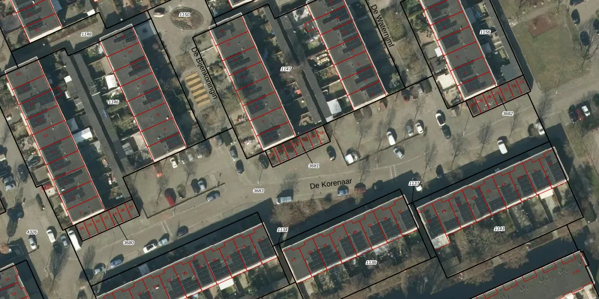 Het perceel waarop De Korenaar 56 staat heeft een oppervlakte van 127 m². Dit is een middelgroot perceel. De perceeloppervlakte wordt geregistreerd door het Kadaster. Gedetailleerde informatie over de maten van dit perceel kunt u vinden in het rapport Kadastrale kaart met maatvoering van De Korenaar 56.