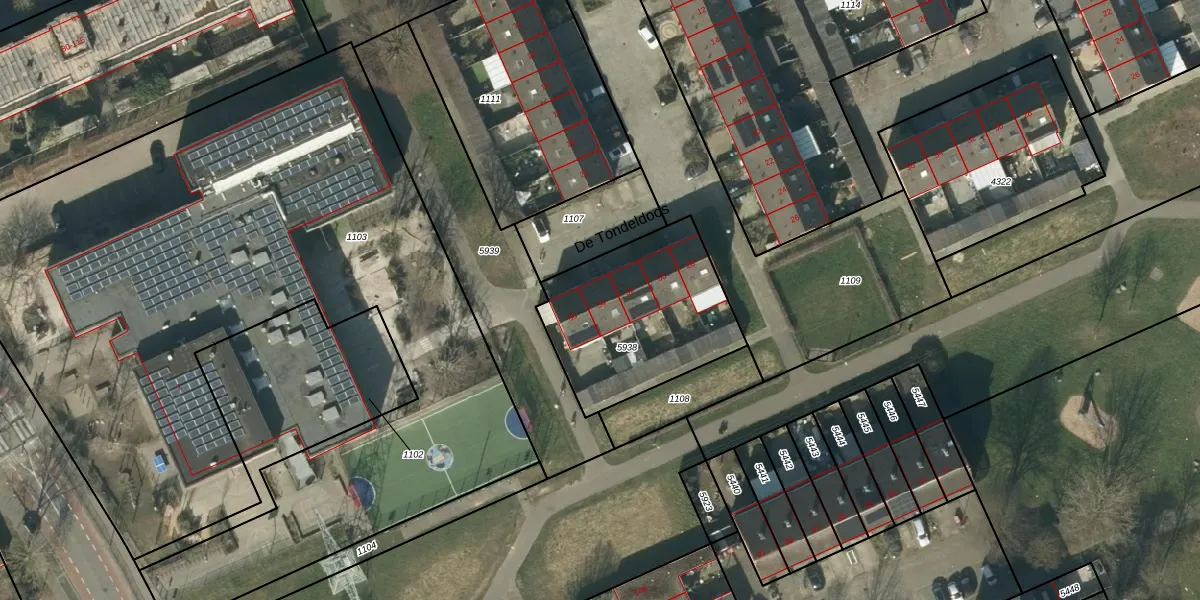 Het perceel waarop De Tondeldoos 34 staat heeft een oppervlakte van 693 m². Dit is een groot perceel. De perceeloppervlakte wordt geregistreerd door het Kadaster. Gedetailleerde informatie over de maten van dit perceel kunt u vinden in het rapport Kadastrale kaart met maatvoering van De Tondeldoos 34.