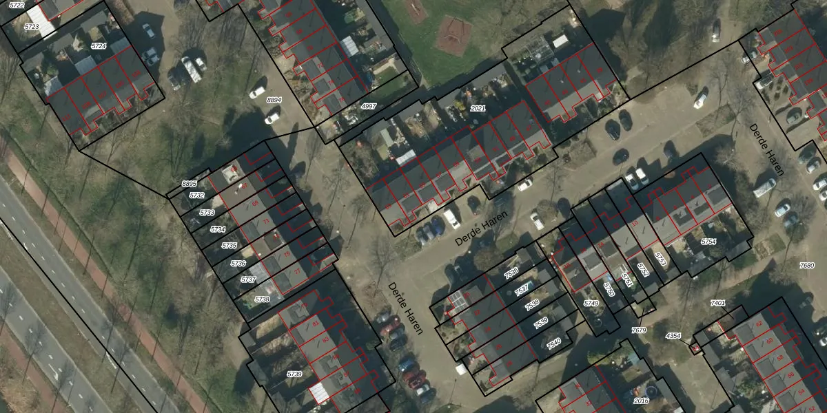Het perceel waarop Derde Haren 61 staat heeft een oppervlakte van 1730 m². Dit is een zeer groot perceel. De perceeloppervlakte wordt geregistreerd door het Kadaster. Gedetailleerde informatie over de maten van dit perceel kunt u vinden in het rapport Kadastrale kaart met maatvoering van Derde Haren 61.