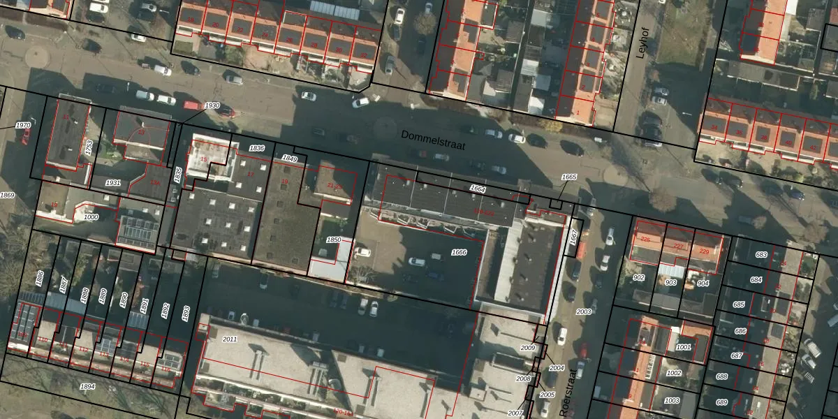 Het perceel waarop Dommelstraat 197 staat heeft een oppervlakte van 1417 m². Dit is een zeer groot perceel. De perceeloppervlakte wordt geregistreerd door het Kadaster. Gedetailleerde informatie over de maten van dit perceel kunt u vinden in het rapport Kadastrale kaart met maatvoering van Dommelstraat 197.