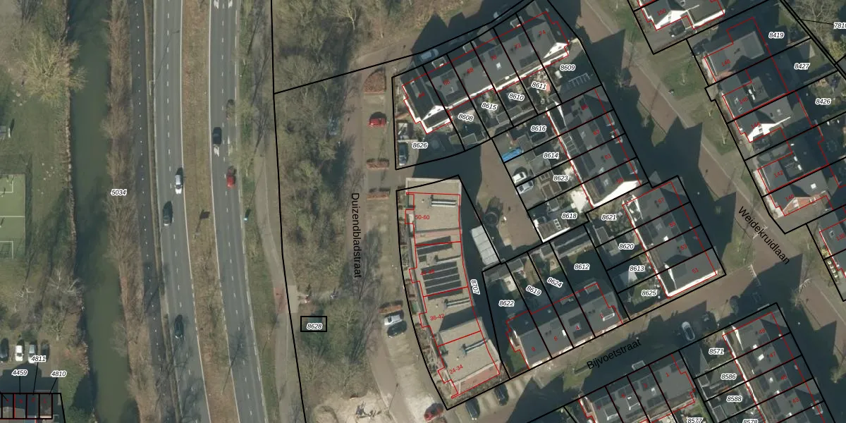 Het perceel waarop Duizendbladstraat 56 staat heeft een oppervlakte van 955 m². Dit is een groot perceel. De perceeloppervlakte wordt geregistreerd door het Kadaster. Gedetailleerde informatie over de maten van dit perceel kunt u vinden in het rapport Kadastrale kaart met maatvoering van Duizendbladstraat 56.