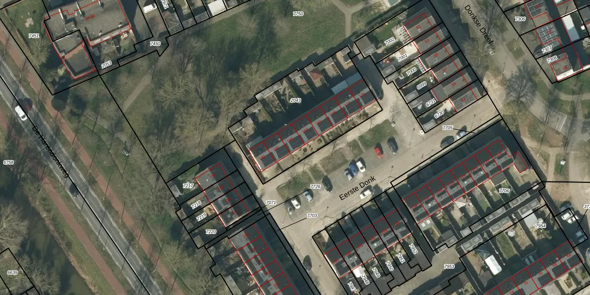 Eerste Donk 185 is gelegen op kadastraal perceel HTG00O2043. Deze kadastrale aanduiding is uniek en wordt gebruikt door het Kadaster om eigendomsrechten en andere zakelijke rechten vast te leggen. Het perceel maakt onderdeel uit van de kadastrale gemeente 's-Hertogenbosch.