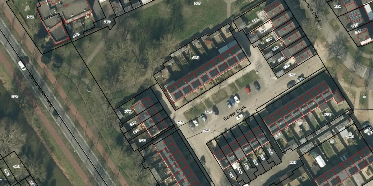 Eerste Donk 187 is gelegen op kadastraal perceel HTG00O2043. Deze kadastrale aanduiding is uniek en wordt gebruikt door het Kadaster om eigendomsrechten en andere zakelijke rechten vast te leggen. Het perceel maakt onderdeel uit van de kadastrale gemeente 's-Hertogenbosch.