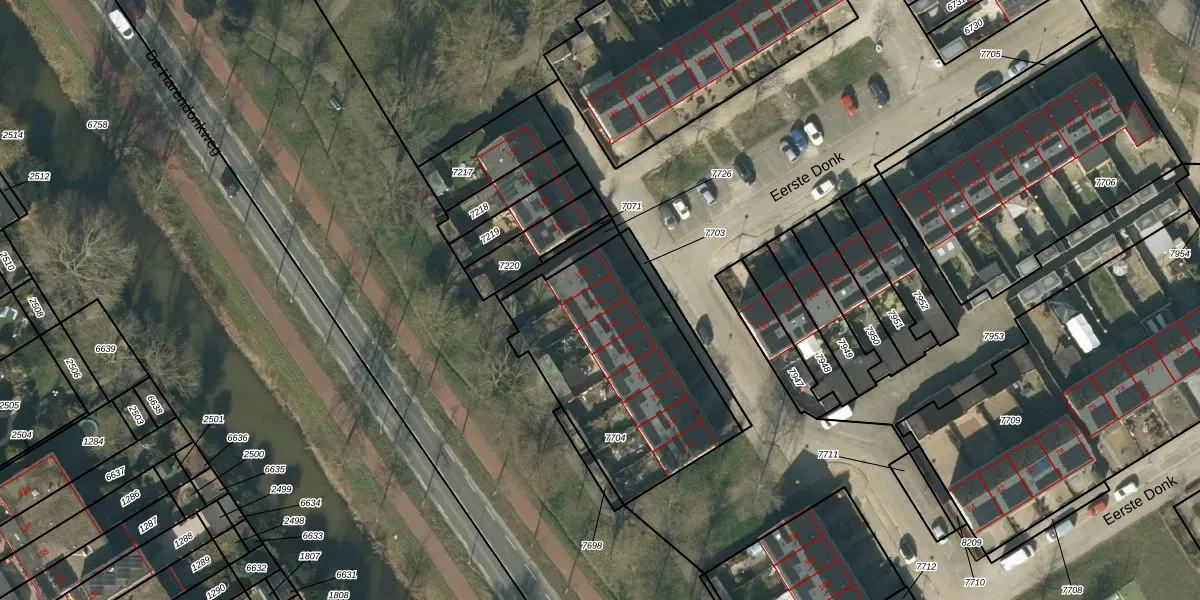 Eerste Donk 201 is gelegen op kadastraal perceel HTG00O7704. Deze kadastrale aanduiding is uniek en wordt gebruikt door het Kadaster om eigendomsrechten en andere zakelijke rechten vast te leggen. Het perceel maakt onderdeel uit van de kadastrale gemeente 's-Hertogenbosch.