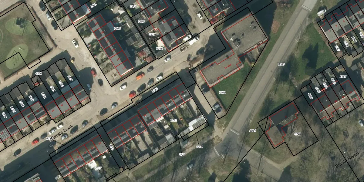 Eerste Donk 45 is gelegen op kadastraal perceel HTG00O7721. Deze kadastrale aanduiding is uniek en wordt gebruikt door het Kadaster om eigendomsrechten en andere zakelijke rechten vast te leggen. Het perceel maakt onderdeel uit van de kadastrale gemeente 's-Hertogenbosch.