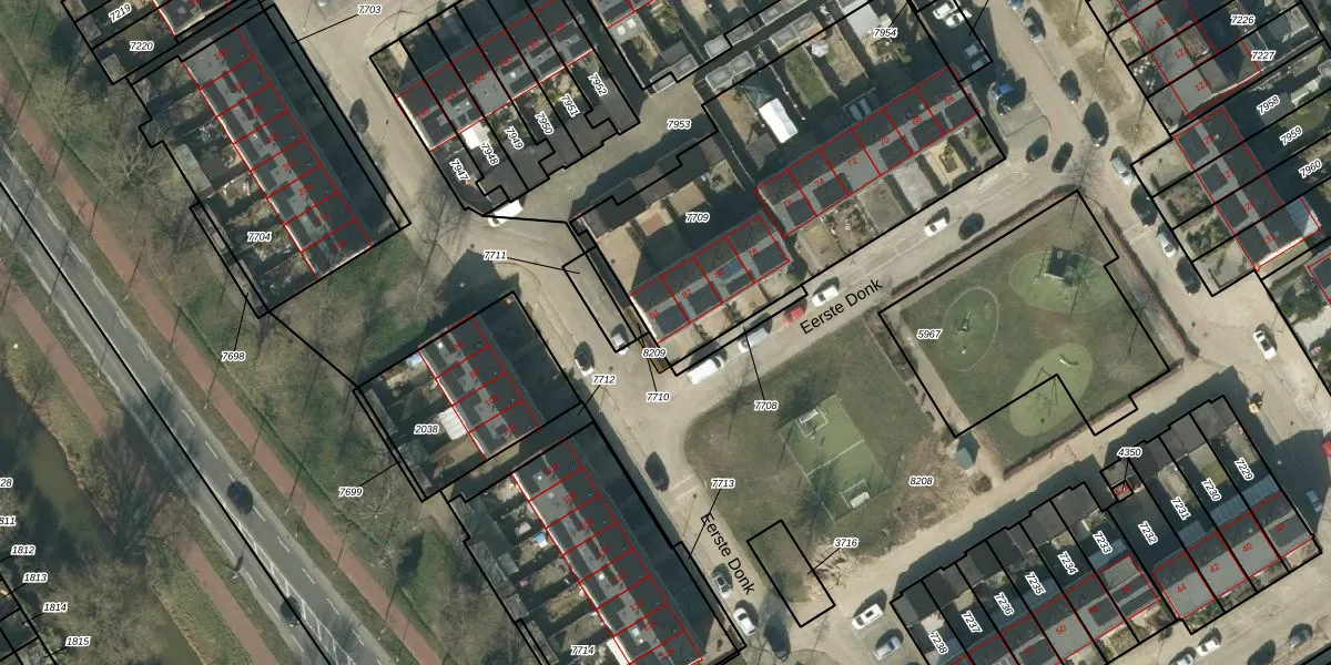 Het perceel waarop Eerste Donk 84 staat heeft een oppervlakte van 1712 m². Dit is een zeer groot perceel. De perceeloppervlakte wordt geregistreerd door het Kadaster. Gedetailleerde informatie over de maten van dit perceel kunt u vinden in het rapport Kadastrale kaart met maatvoering van Eerste Donk 84.