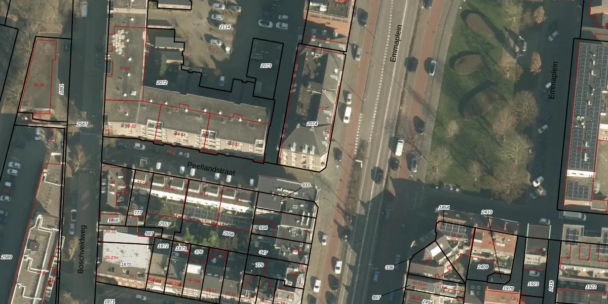 Het perceel waarop Emmaplein 2-K staat heeft een oppervlakte van 690 m². Dit is een groot perceel. De perceeloppervlakte wordt geregistreerd door het Kadaster. Gedetailleerde informatie over de maten van dit perceel kunt u vinden in het rapport Kadastrale kaart met maatvoering van Emmaplein 2-K.