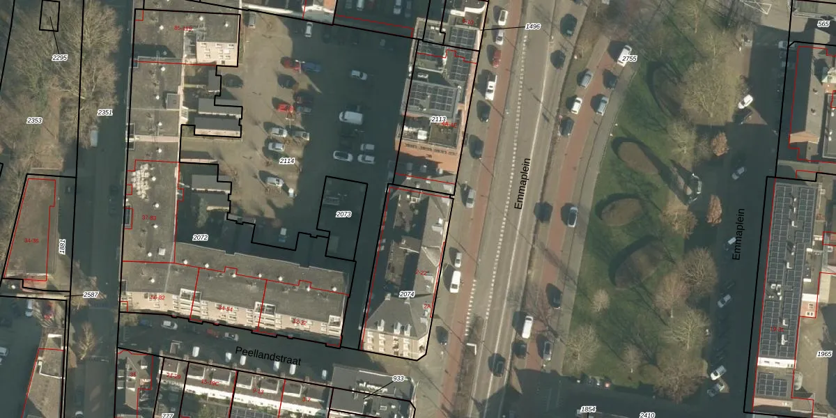 Het perceel waarop Emmaplein 2-P staat heeft een oppervlakte van 690 m². Dit is een groot perceel. De perceeloppervlakte wordt geregistreerd door het Kadaster. Gedetailleerde informatie over de maten van dit perceel kunt u vinden in het rapport Kadastrale kaart met maatvoering van Emmaplein 2-P.