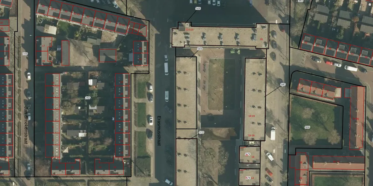 Het perceel waarop Erasmusstraat 19 staat heeft een oppervlakte van 442 m². Dit is een groot perceel. De perceeloppervlakte wordt geregistreerd door het Kadaster. Gedetailleerde informatie over de maten van dit perceel kunt u vinden in het rapport Kadastrale kaart met maatvoering van Erasmusstraat 19.