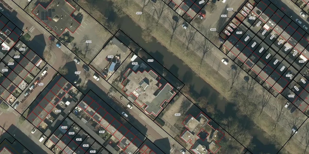 Het perceel waarop Evertsenstraat 7-E staat heeft een oppervlakte van 1027 m². Dit is een zeer groot perceel. De perceeloppervlakte wordt geregistreerd door het Kadaster. Gedetailleerde informatie over de maten van dit perceel kunt u vinden in het rapport Kadastrale kaart met maatvoering van Evertsenstraat 7-E.