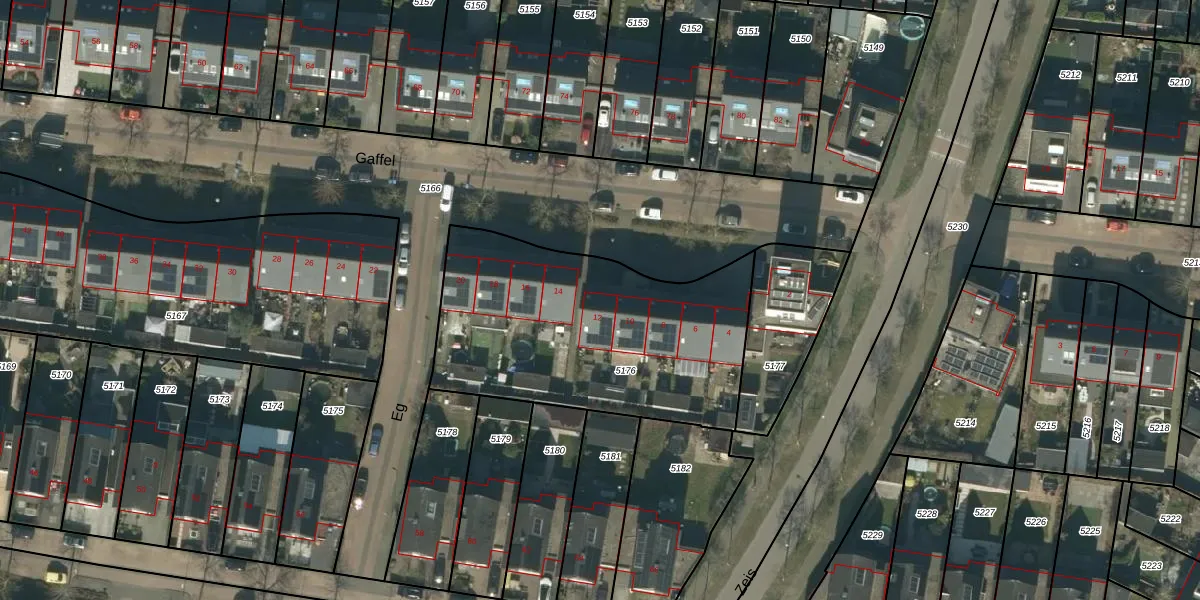 Het perceel waarop Gaffel 12 staat heeft een oppervlakte van 1316 m². Dit is een zeer groot perceel. De perceeloppervlakte wordt geregistreerd door het Kadaster. Gedetailleerde informatie over de maten van dit perceel kunt u vinden in het rapport Kadastrale kaart met maatvoering van Gaffel 12.