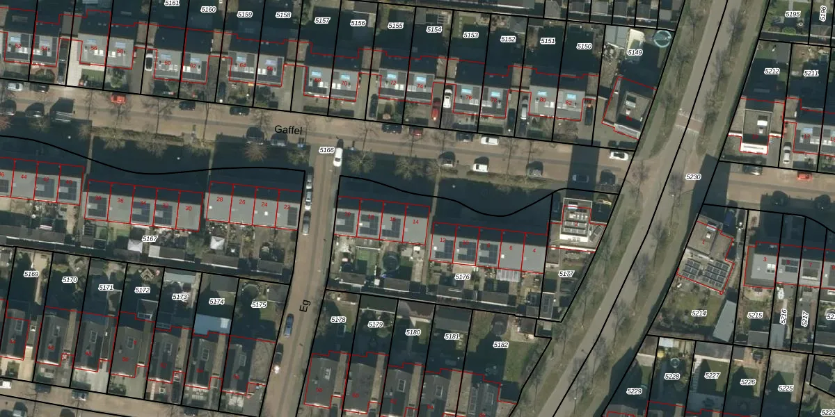 Het perceel waarop Gaffel 14 staat heeft een oppervlakte van 1316 m². Dit is een zeer groot perceel. De perceeloppervlakte wordt geregistreerd door het Kadaster. Gedetailleerde informatie over de maten van dit perceel kunt u vinden in het rapport Kadastrale kaart met maatvoering van Gaffel 14.