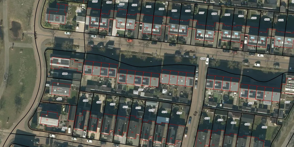 Het perceel waarop Gaffel 32 staat heeft een oppervlakte van 1870 m². Dit is een zeer groot perceel. De perceeloppervlakte wordt geregistreerd door het Kadaster. Gedetailleerde informatie over de maten van dit perceel kunt u vinden in het rapport Kadastrale kaart met maatvoering van Gaffel 32.