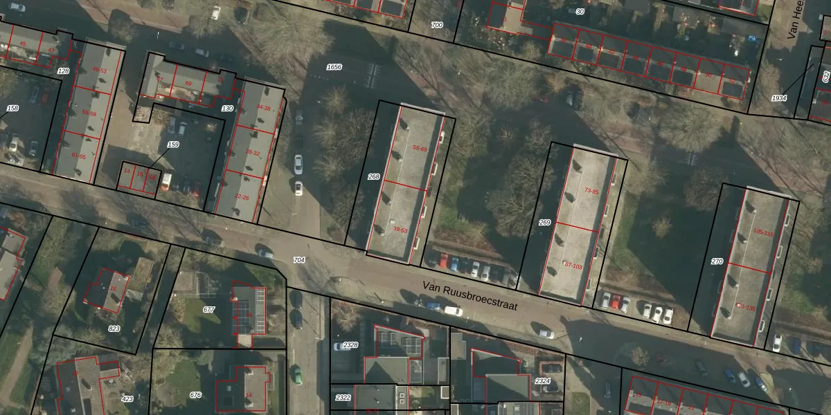 Het perceel waarop Geert Grootestraat 53 staat heeft een oppervlakte van 695 m². Dit is een groot perceel. De perceeloppervlakte wordt geregistreerd door het Kadaster. Gedetailleerde informatie over de maten van dit perceel kunt u vinden in het rapport Kadastrale kaart met maatvoering van Geert Grootestraat 53.