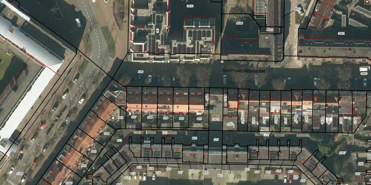 Het perceel waarop Geert van Woustraat 15 staat heeft een oppervlakte van 185 m². Dit is een middelgroot perceel. De perceeloppervlakte wordt geregistreerd door het Kadaster. Gedetailleerde informatie over de maten van dit perceel kunt u vinden in het rapport Kadastrale kaart met maatvoering van Geert van Woustraat 15.