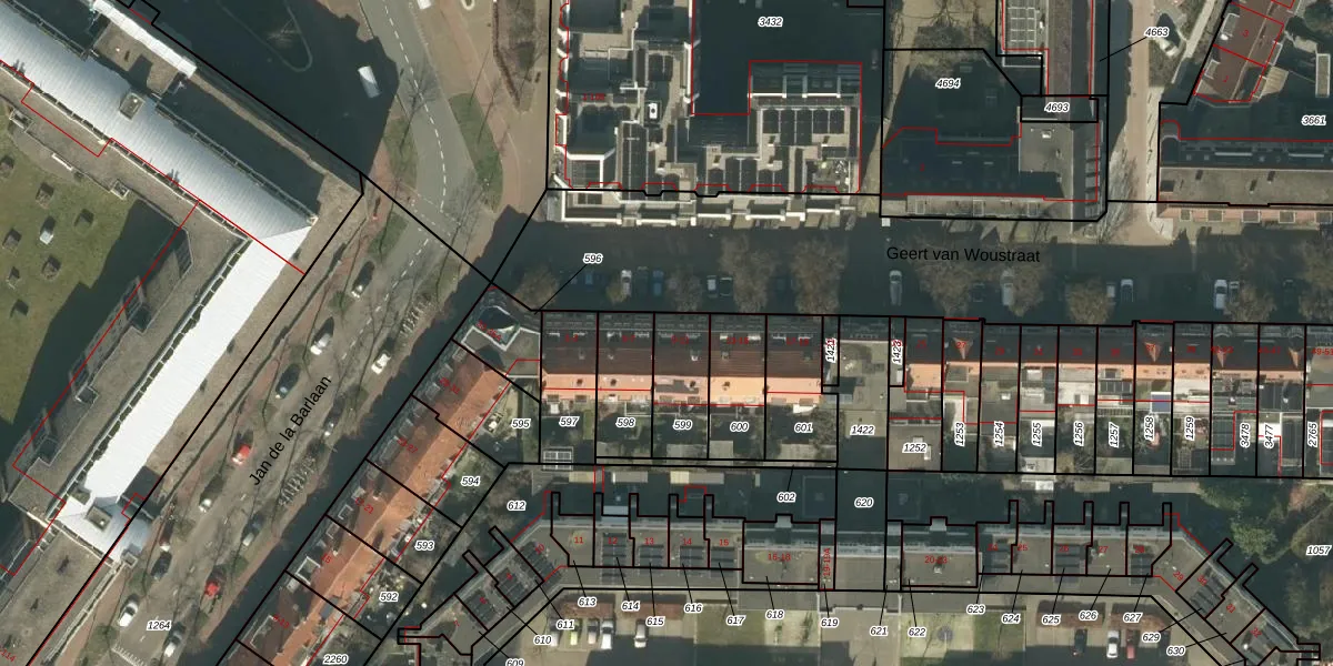 Het perceel waarop Geert van Woustraat 9 staat heeft een oppervlakte van 184 m². Dit is een middelgroot perceel. De perceeloppervlakte wordt geregistreerd door het Kadaster. Gedetailleerde informatie over de maten van dit perceel kunt u vinden in het rapport Kadastrale kaart met maatvoering van Geert van Woustraat 9.