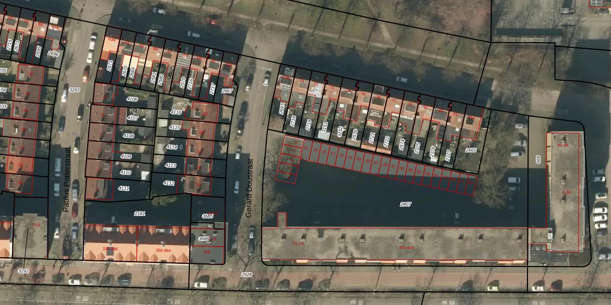 Het perceel waarop Gerard Doustraat 11 staat heeft een oppervlakte van 3475 m². Dit is een zeer groot perceel. De perceeloppervlakte wordt geregistreerd door het Kadaster. Gedetailleerde informatie over de maten van dit perceel kunt u vinden in het rapport Kadastrale kaart met maatvoering van Gerard Doustraat 11.