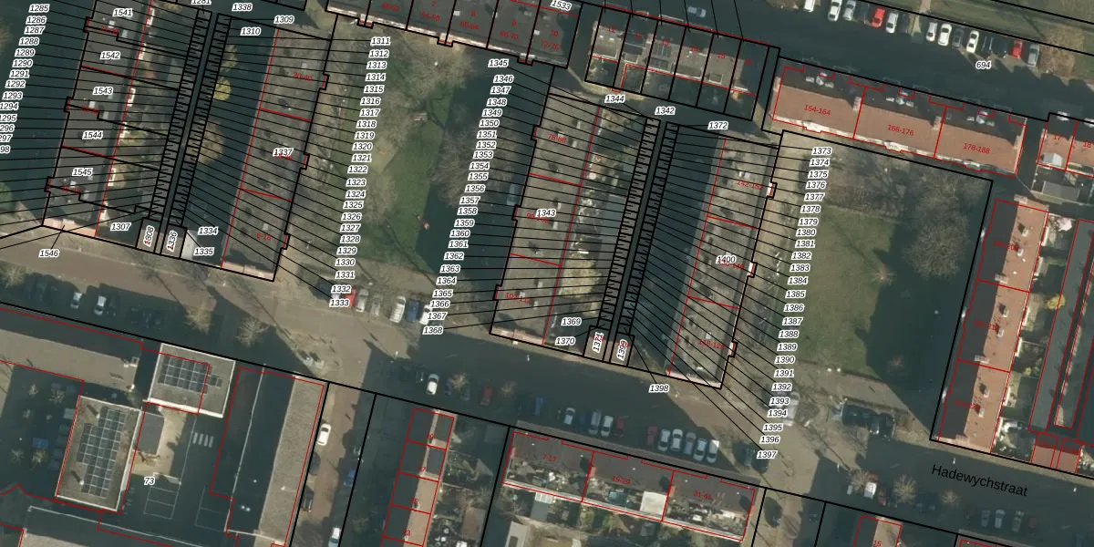 Hadewychstraat 106 is gelegen op kadastraal perceel HTG00N1343. Deze kadastrale aanduiding is uniek en wordt gebruikt door het Kadaster om eigendomsrechten en andere zakelijke rechten vast te leggen. Het perceel maakt onderdeel uit van de kadastrale gemeente 's-Hertogenbosch.