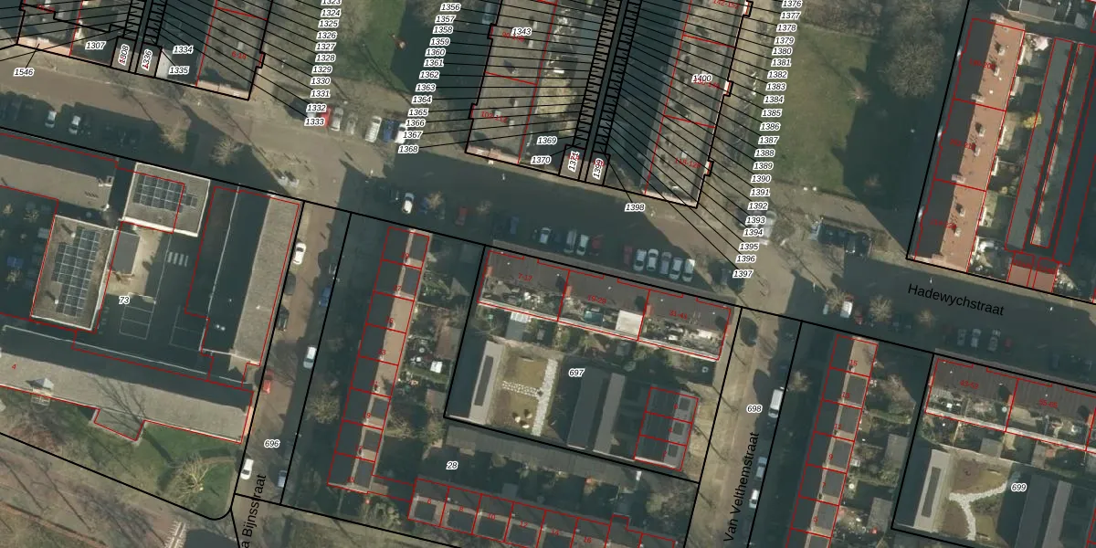 Het perceel waarop Hadewychstraat 13 staat heeft een oppervlakte van 1591 m². Dit is een zeer groot perceel. De perceeloppervlakte wordt geregistreerd door het Kadaster. Gedetailleerde informatie over de maten van dit perceel kunt u vinden in het rapport Kadastrale kaart met maatvoering van Hadewychstraat 13.