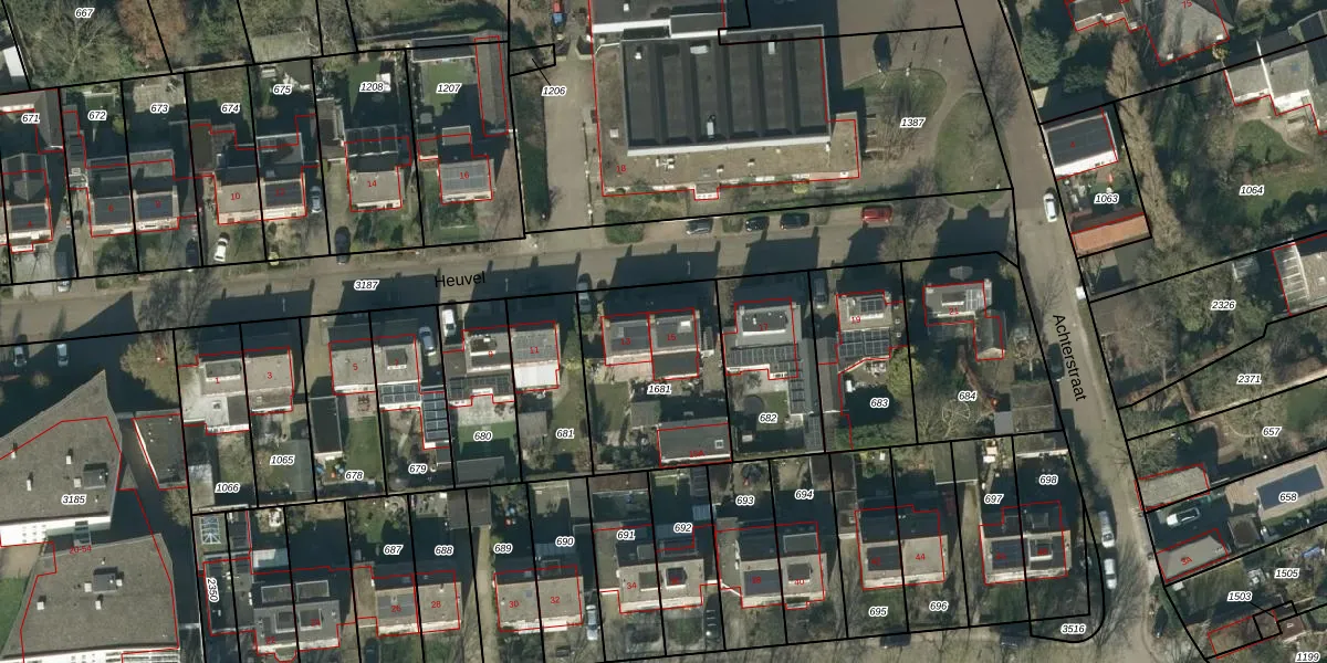 Het perceel waarop Heuvel 15 staat heeft een oppervlakte van 586 m². Dit is een groot perceel. De perceeloppervlakte wordt geregistreerd door het Kadaster. Gedetailleerde informatie over de maten van dit perceel kunt u vinden in het rapport Kadastrale kaart met maatvoering van Heuvel 15.