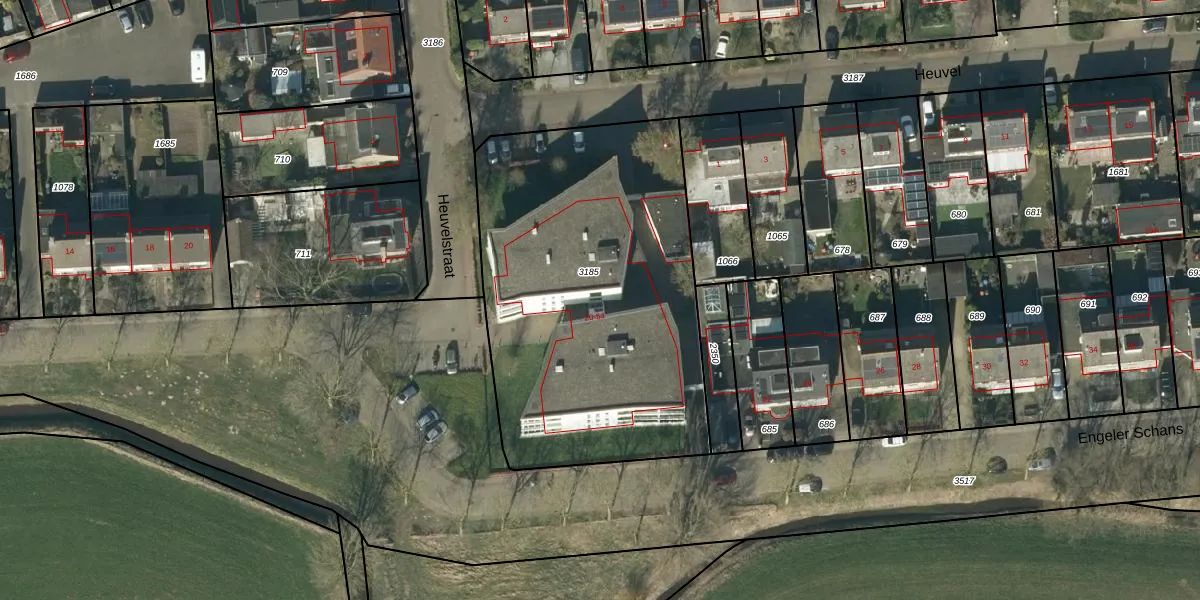 Heuvelstraat 32 is gelegen op kadastraal perceel HTG00R3185. Deze kadastrale aanduiding is uniek en wordt gebruikt door het Kadaster om eigendomsrechten en andere zakelijke rechten vast te leggen. Het perceel maakt onderdeel uit van de kadastrale gemeente 's-Hertogenbosch.