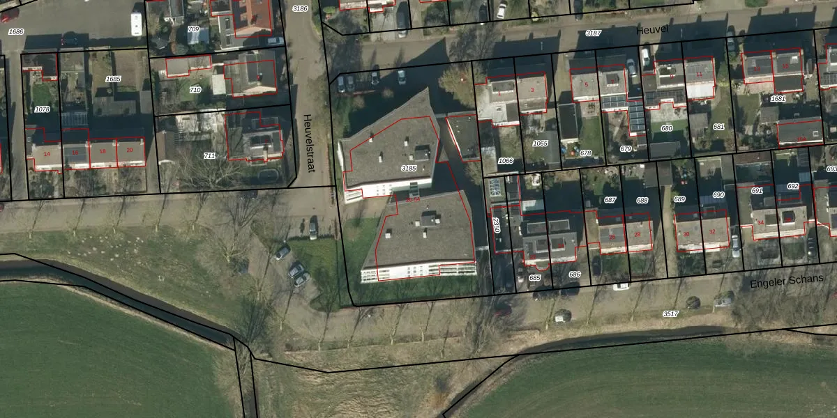 Heuvelstraat 38 is gelegen op kadastraal perceel HTG00R3185. Deze kadastrale aanduiding is uniek en wordt gebruikt door het Kadaster om eigendomsrechten en andere zakelijke rechten vast te leggen. Het perceel maakt onderdeel uit van de kadastrale gemeente 's-Hertogenbosch.