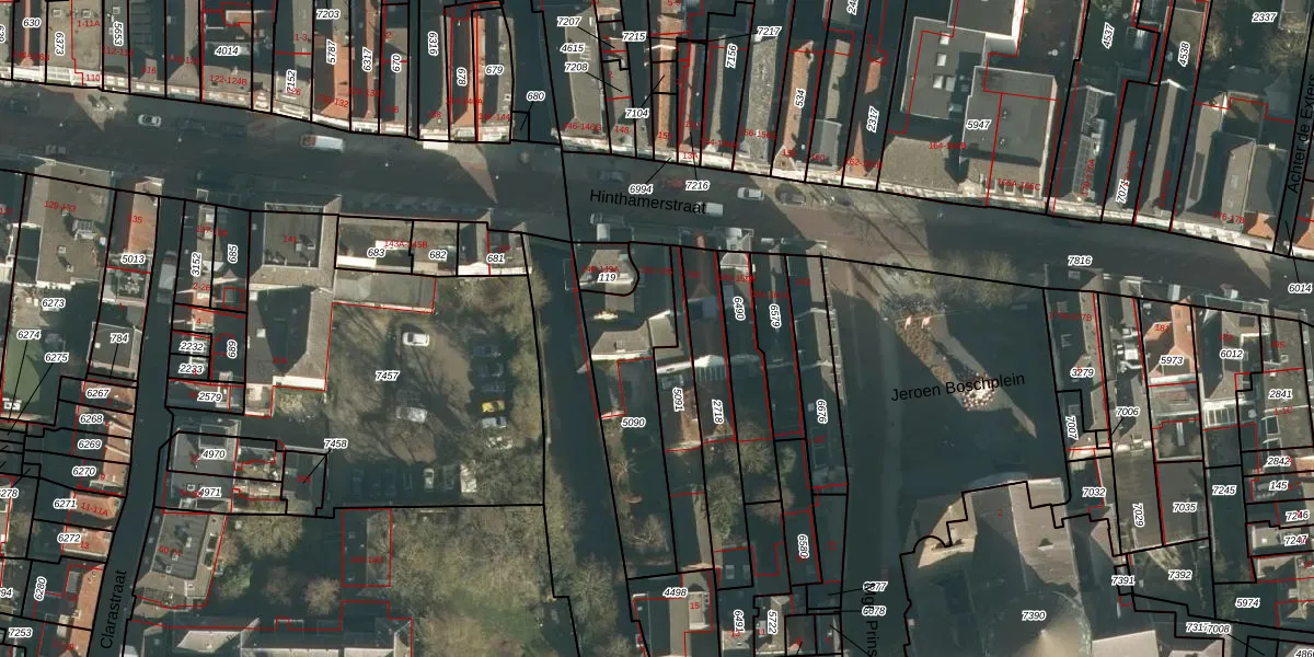 Hinthamerstraat 155 is gelegen op kadastraal perceel HTG00H5090. Deze kadastrale aanduiding is uniek en wordt gebruikt door het Kadaster om eigendomsrechten en andere zakelijke rechten vast te leggen. Het perceel maakt onderdeel uit van de kadastrale gemeente 's-Hertogenbosch.