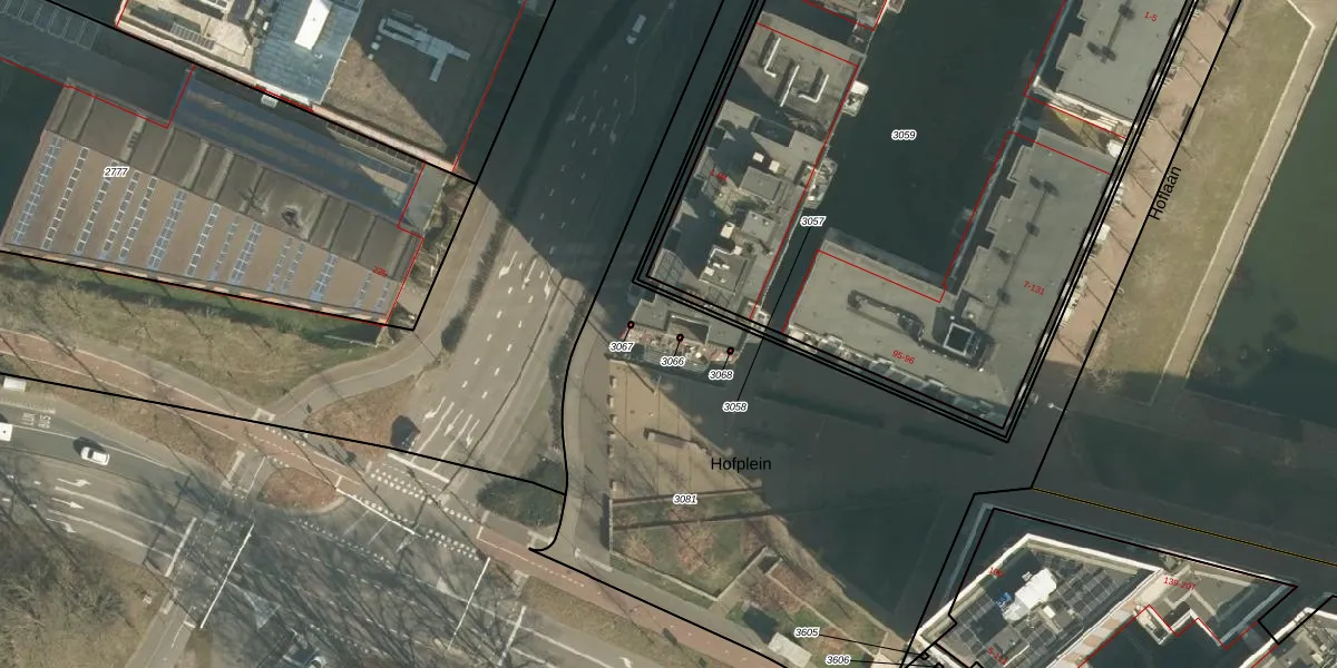 Het perceel waarop Hofplein 44 staat heeft een oppervlakte van 4180 m². Dit is een zeer groot perceel. De perceeloppervlakte wordt geregistreerd door het Kadaster. Gedetailleerde informatie over de maten van dit perceel kunt u vinden in het rapport Kadastrale kaart met maatvoering van Hofplein 44.