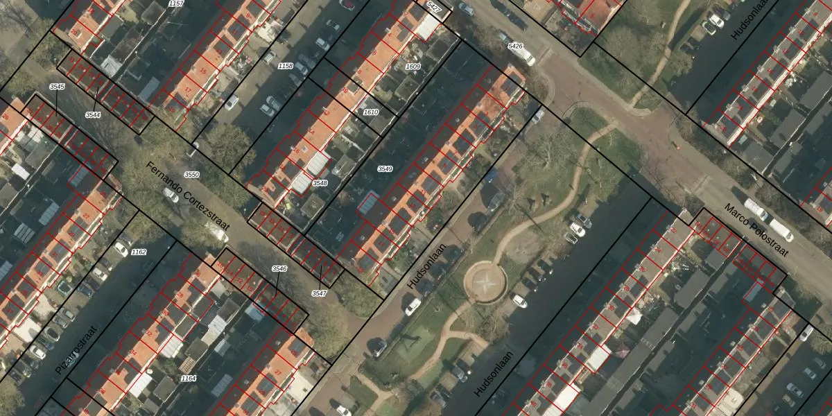 Het perceel waarop Hudsonlaan 13 staat heeft een oppervlakte van 1502 m². Dit is een zeer groot perceel. De perceeloppervlakte wordt geregistreerd door het Kadaster. Gedetailleerde informatie over de maten van dit perceel kunt u vinden in het rapport Kadastrale kaart met maatvoering van Hudsonlaan 13.