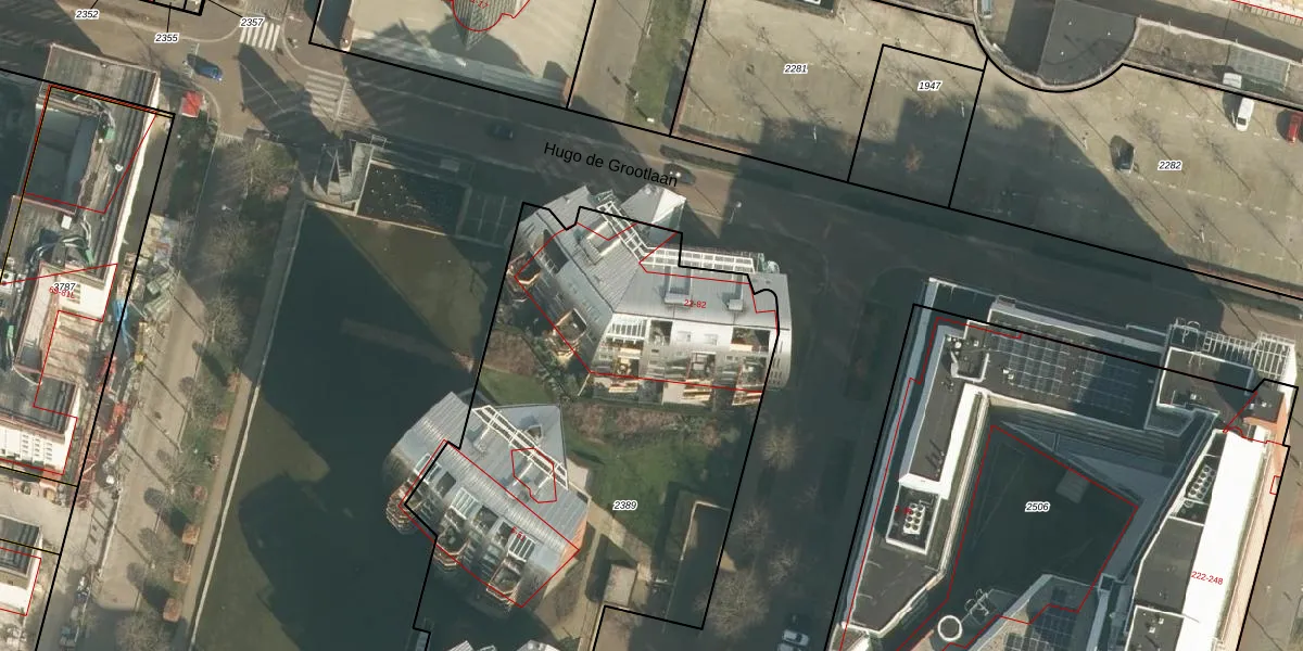 Het perceel waarop Hugo de Grootlaan 56 staat heeft een oppervlakte van 2945 m². Dit is een zeer groot perceel. De perceeloppervlakte wordt geregistreerd door het Kadaster. Gedetailleerde informatie over de maten van dit perceel kunt u vinden in het rapport Kadastrale kaart met maatvoering van Hugo de Grootlaan 56.