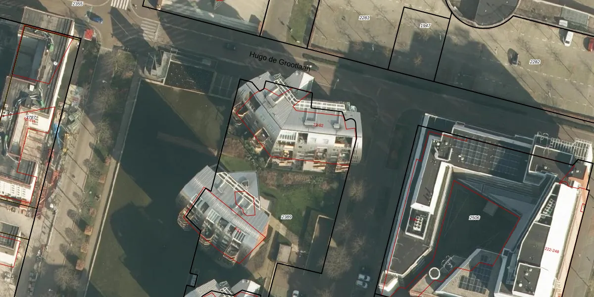 Het perceel waarop Hugo de Grootlaan 76 staat heeft een oppervlakte van 2945 m². Dit is een zeer groot perceel. De perceeloppervlakte wordt geregistreerd door het Kadaster. Gedetailleerde informatie over de maten van dit perceel kunt u vinden in het rapport Kadastrale kaart met maatvoering van Hugo de Grootlaan 76.