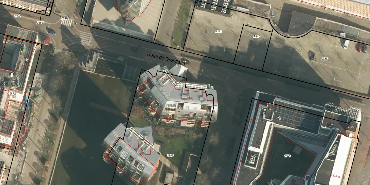 Het perceel waarop Hugo de Grootlaan 82 staat heeft een oppervlakte van 2945 m². Dit is een zeer groot perceel. De perceeloppervlakte wordt geregistreerd door het Kadaster. Gedetailleerde informatie over de maten van dit perceel kunt u vinden in het rapport Kadastrale kaart met maatvoering van Hugo de Grootlaan 82.