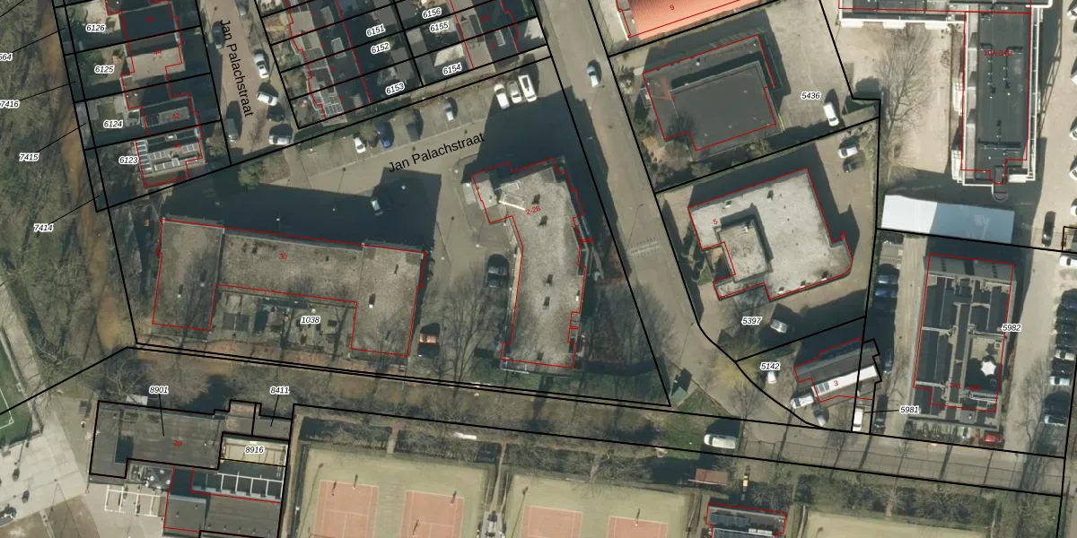 Het perceel waarop Jan Palachstraat 8 staat heeft een oppervlakte van 4198 m². Dit is een zeer groot perceel. De perceeloppervlakte wordt geregistreerd door het Kadaster. Gedetailleerde informatie over de maten van dit perceel kunt u vinden in het rapport Kadastrale kaart met maatvoering van Jan Palachstraat 8.