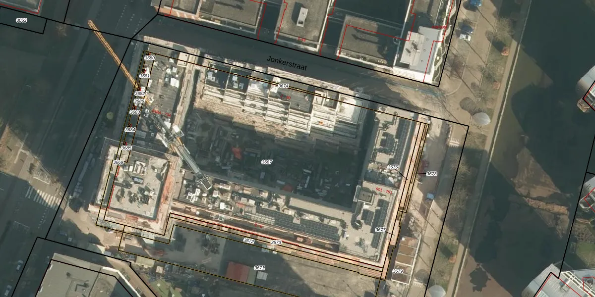 Het perceel waarop Jonkerstraat 64 staat heeft een oppervlakte van 4877 m². Dit is een zeer groot perceel. De perceeloppervlakte wordt geregistreerd door het Kadaster. Gedetailleerde informatie over de maten van dit perceel kunt u vinden in het rapport Kadastrale kaart met maatvoering van Jonkerstraat 64.