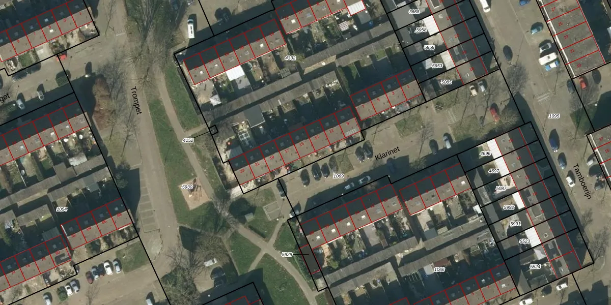 Het perceel waarop Klarinet 15 staat heeft een oppervlakte van 3490 m². Dit is een zeer groot perceel. De perceeloppervlakte wordt geregistreerd door het Kadaster. Gedetailleerde informatie over de maten van dit perceel kunt u vinden in het rapport Kadastrale kaart met maatvoering van Klarinet 15.