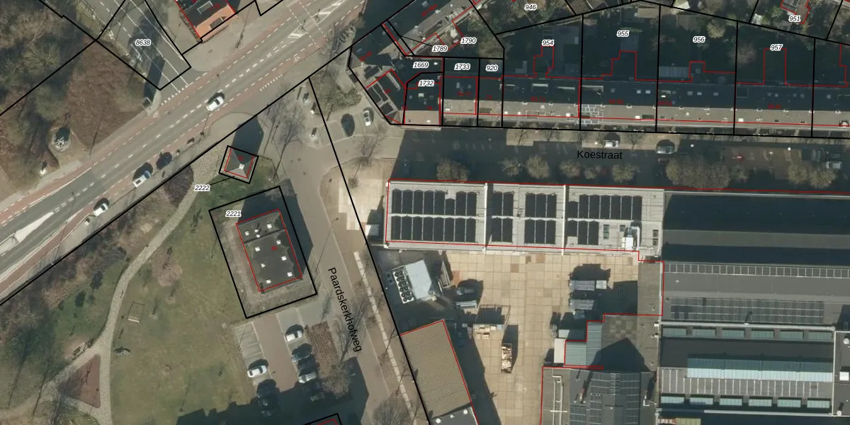 Het perceel waarop Koestraat 80 staat heeft een oppervlakte van 4,5 ha. Dit is een zeer groot perceel. De perceeloppervlakte wordt geregistreerd door het Kadaster. Gedetailleerde informatie over de maten van dit perceel kunt u vinden in het rapport Kadastrale kaart met maatvoering van Koestraat 80.