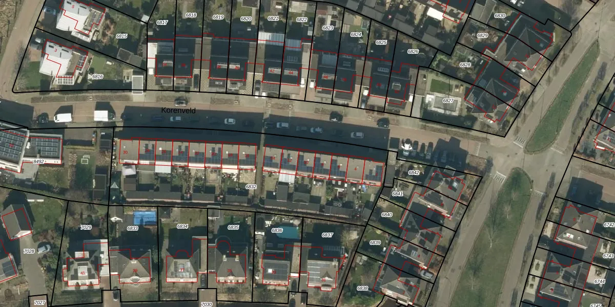 Het perceel waarop Korenveld 10 staat heeft een oppervlakte van 2257 m². Dit is een zeer groot perceel. De perceeloppervlakte wordt geregistreerd door het Kadaster. Gedetailleerde informatie over de maten van dit perceel kunt u vinden in het rapport Kadastrale kaart met maatvoering van Korenveld 10.