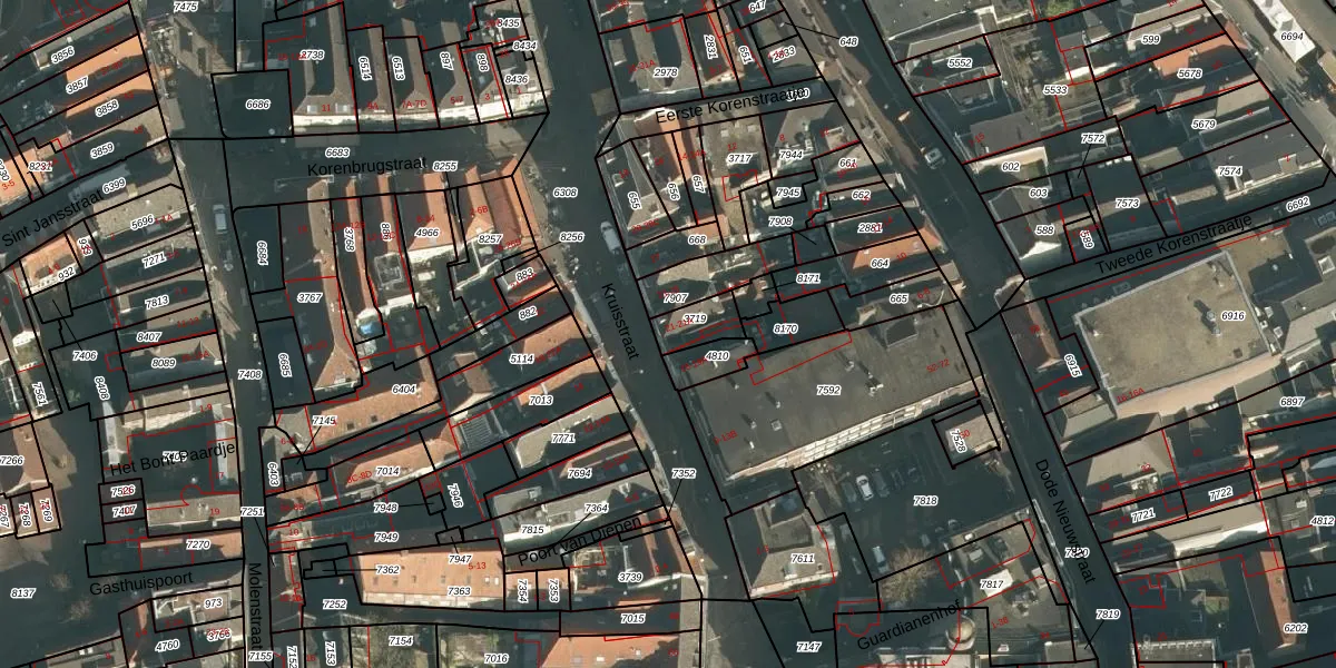 Het perceel waarop Kruisstraat 21 staat heeft een oppervlakte van 76 m². Dit is een klein perceel. De perceeloppervlakte wordt geregistreerd door het Kadaster. Gedetailleerde informatie over de maten van dit perceel kunt u vinden in het rapport Kadastrale kaart met maatvoering van Kruisstraat 21.