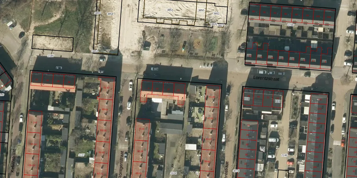 Het perceel waarop Lorentzstraat 18 staat heeft een oppervlakte van 4423 m². Dit is een zeer groot perceel. De perceeloppervlakte wordt geregistreerd door het Kadaster. Gedetailleerde informatie over de maten van dit perceel kunt u vinden in het rapport Kadastrale kaart met maatvoering van Lorentzstraat 18.