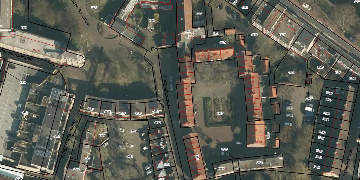 Het perceel waarop Louwschepoort 69 staat heeft een oppervlakte van 1228 m². Dit is een zeer groot perceel. De perceeloppervlakte wordt geregistreerd door het Kadaster. Gedetailleerde informatie over de maten van dit perceel kunt u vinden in het rapport Kadastrale kaart met maatvoering van Louwschepoort 69.