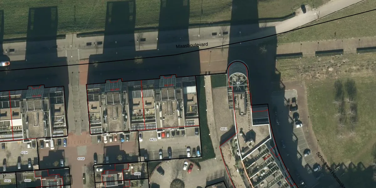 Het perceel waarop Maasboulevard 317 staat heeft een oppervlakte van 2120 m². Dit is een zeer groot perceel. De perceeloppervlakte wordt geregistreerd door het Kadaster. Gedetailleerde informatie over de maten van dit perceel kunt u vinden in het rapport Kadastrale kaart met maatvoering van Maasboulevard 317.