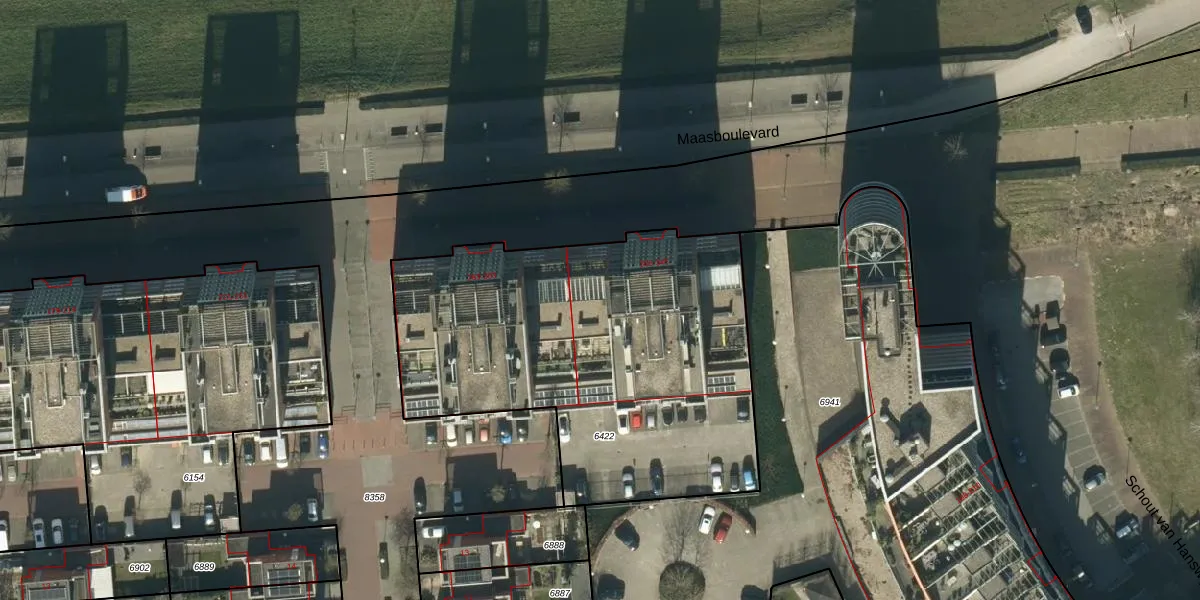 Het perceel waarop Maasboulevard 321 staat heeft een oppervlakte van 2120 m². Dit is een zeer groot perceel. De perceeloppervlakte wordt geregistreerd door het Kadaster. Gedetailleerde informatie over de maten van dit perceel kunt u vinden in het rapport Kadastrale kaart met maatvoering van Maasboulevard 321.