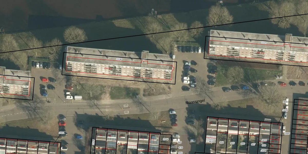 Het perceel waarop Maassingel 282 staat heeft een oppervlakte van 1071 m². Dit is een zeer groot perceel. De perceeloppervlakte wordt geregistreerd door het Kadaster. Gedetailleerde informatie over de maten van dit perceel kunt u vinden in het rapport Kadastrale kaart met maatvoering van Maassingel 282.