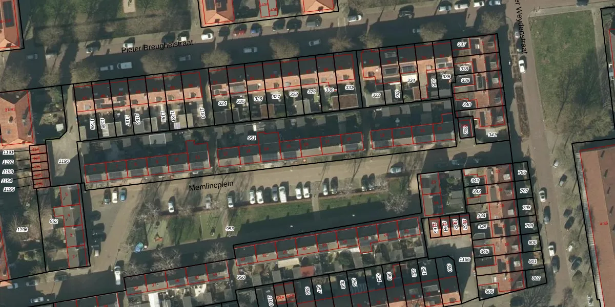 Het perceel waarop Memlincplein 16 staat heeft een oppervlakte van 1958 m². Dit is een zeer groot perceel. De perceeloppervlakte wordt geregistreerd door het Kadaster. Gedetailleerde informatie over de maten van dit perceel kunt u vinden in het rapport Kadastrale kaart met maatvoering van Memlincplein 16.