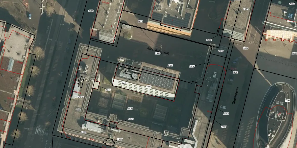 Het perceel waarop Mercatorplein 1 staat heeft een oppervlakte van 557 m². Dit is een groot perceel. De perceeloppervlakte wordt geregistreerd door het Kadaster. Gedetailleerde informatie over de maten van dit perceel kunt u vinden in het rapport Kadastrale kaart met maatvoering van Mercatorplein 1.