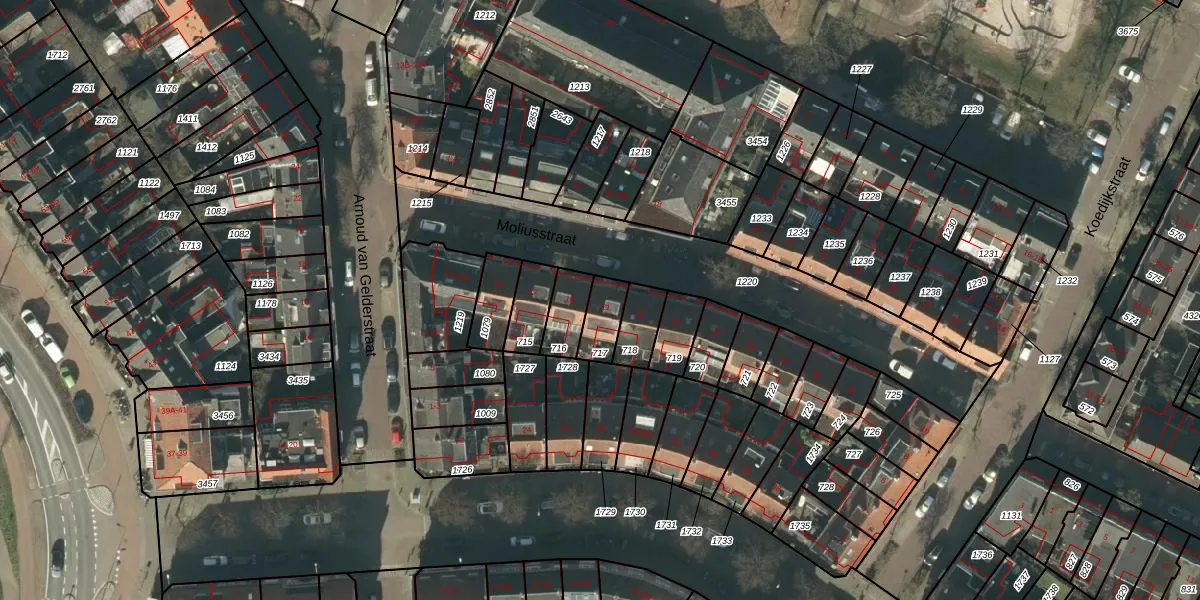 Het perceel waarop Moliusstraat 21 staat heeft een oppervlakte van 85 m². Dit is een klein perceel. De perceeloppervlakte wordt geregistreerd door het Kadaster. Gedetailleerde informatie over de maten van dit perceel kunt u vinden in het rapport Kadastrale kaart met maatvoering van Moliusstraat 21.