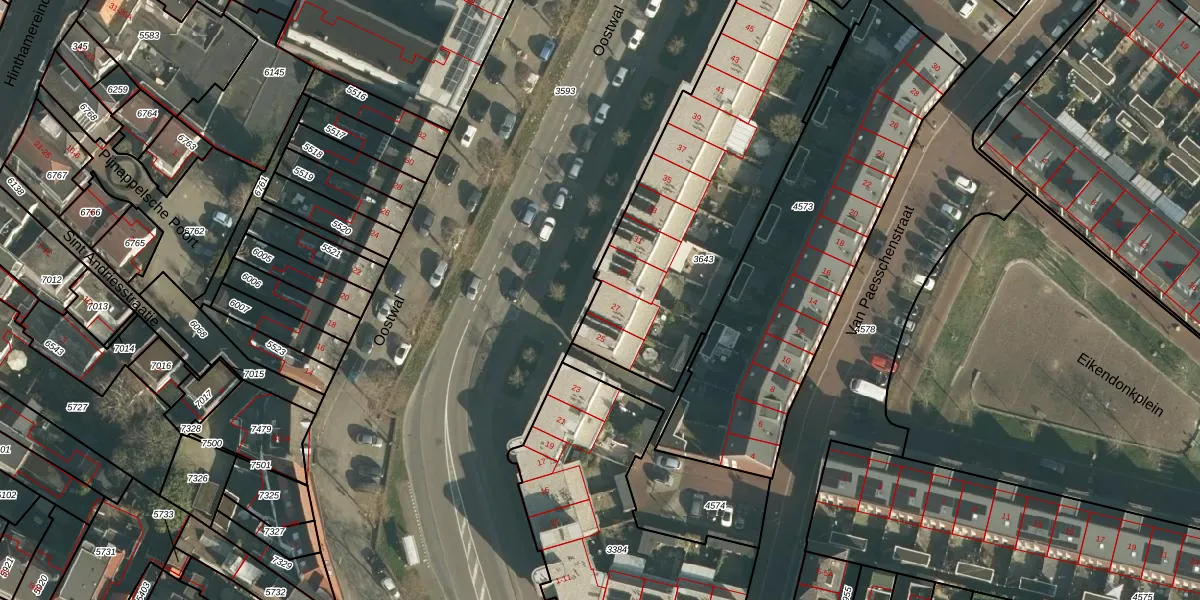 Het perceel waarop Oostwal 27 staat heeft een oppervlakte van 1375 m². Dit is een zeer groot perceel. De perceeloppervlakte wordt geregistreerd door het Kadaster. Gedetailleerde informatie over de maten van dit perceel kunt u vinden in het rapport Kadastrale kaart met maatvoering van Oostwal 27.