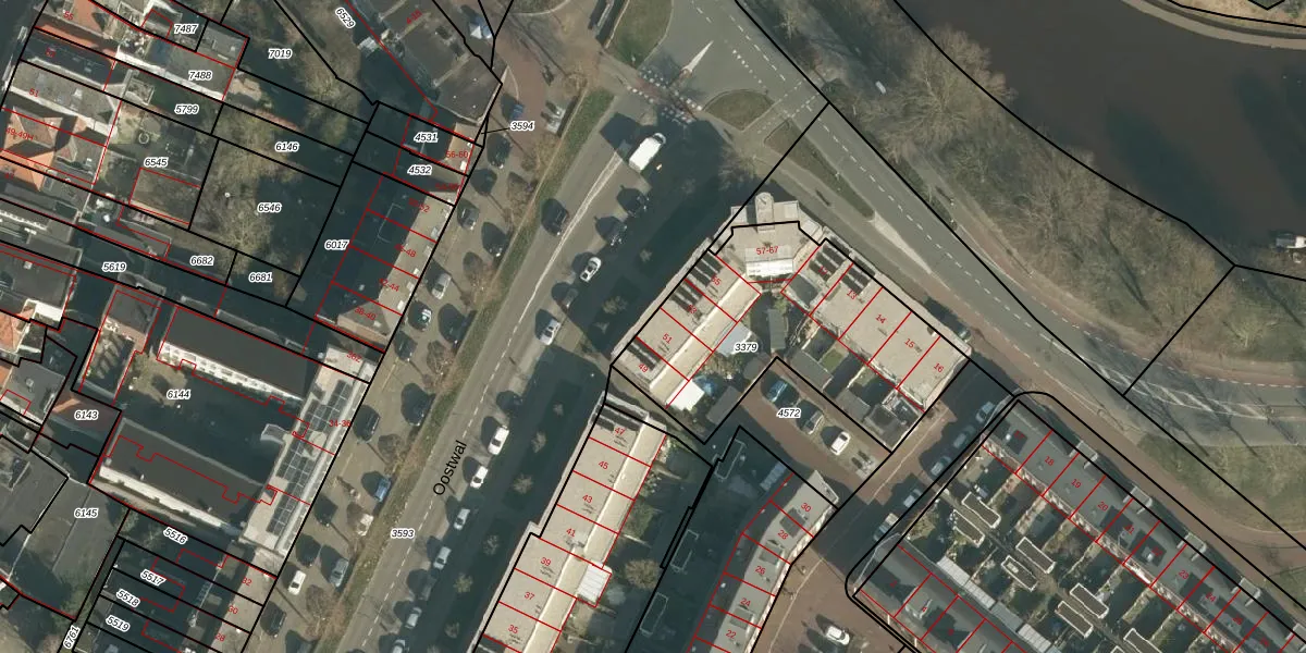 Het perceel waarop Oostwal 51 staat heeft een oppervlakte van 1050 m². Dit is een zeer groot perceel. De perceeloppervlakte wordt geregistreerd door het Kadaster. Gedetailleerde informatie over de maten van dit perceel kunt u vinden in het rapport Kadastrale kaart met maatvoering van Oostwal 51.