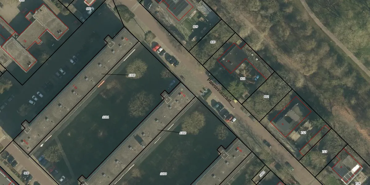Het perceel waarop Palestrinastraat 43 staat heeft een oppervlakte van 979 m². Dit is een groot perceel. De perceeloppervlakte wordt geregistreerd door het Kadaster. Gedetailleerde informatie over de maten van dit perceel kunt u vinden in het rapport Kadastrale kaart met maatvoering van Palestrinastraat 43.